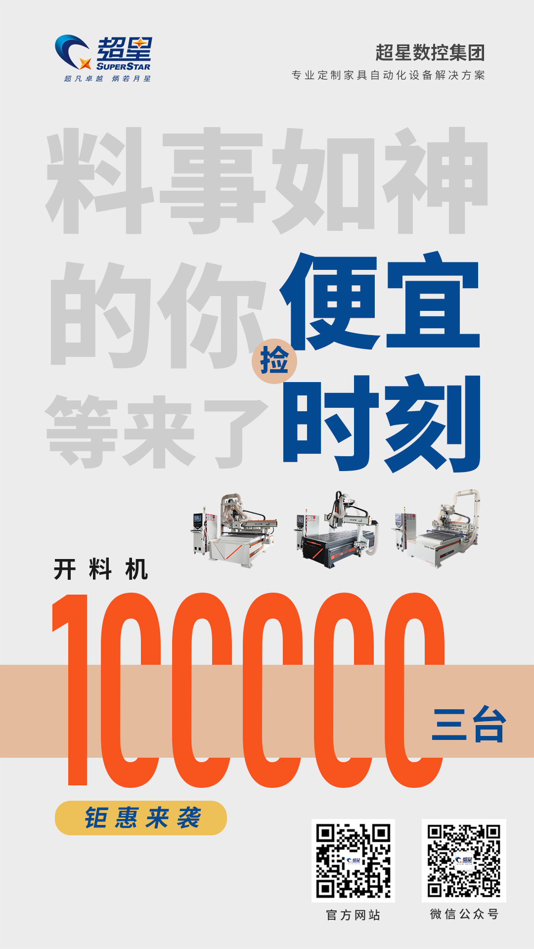 2025年9月9日至12日,超星數(shù)控將攜兩款創(chuàng)新產(chǎn)品,重磅亮相中國(guó)(上海)國(guó)際家具生產(chǎn)設(shè)備及木工機(jī)械展覽會(huì),此次參展,超星數(shù)控將推出“十萬(wàn)三臺(tái)開料機(jī)”的鉅惠活動(dòng),以此回饋新老客戶一直以來(lái)的支持和信任。